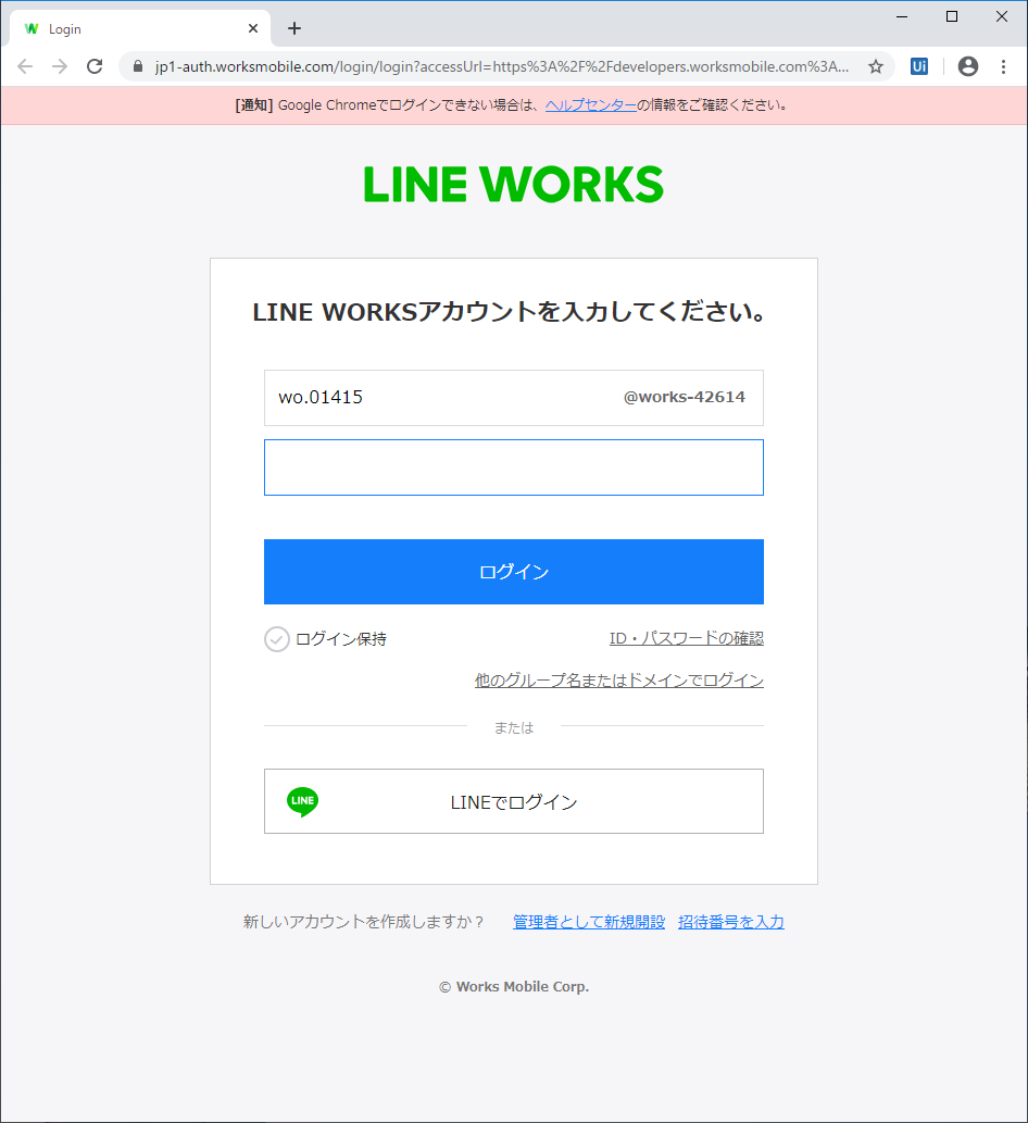 LINE WORKSアカウントの情報を入力し、ログインします。