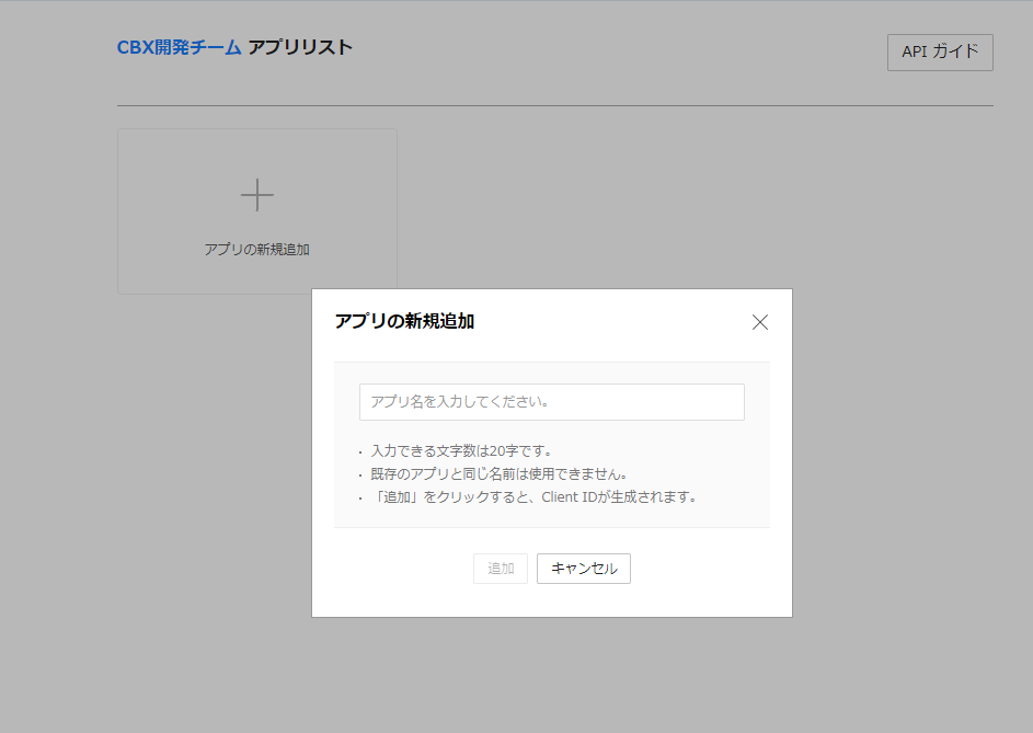 - ポップアップするアプリ名の登録画面に任意の名称を入力し、追加ボタンをクリックします。