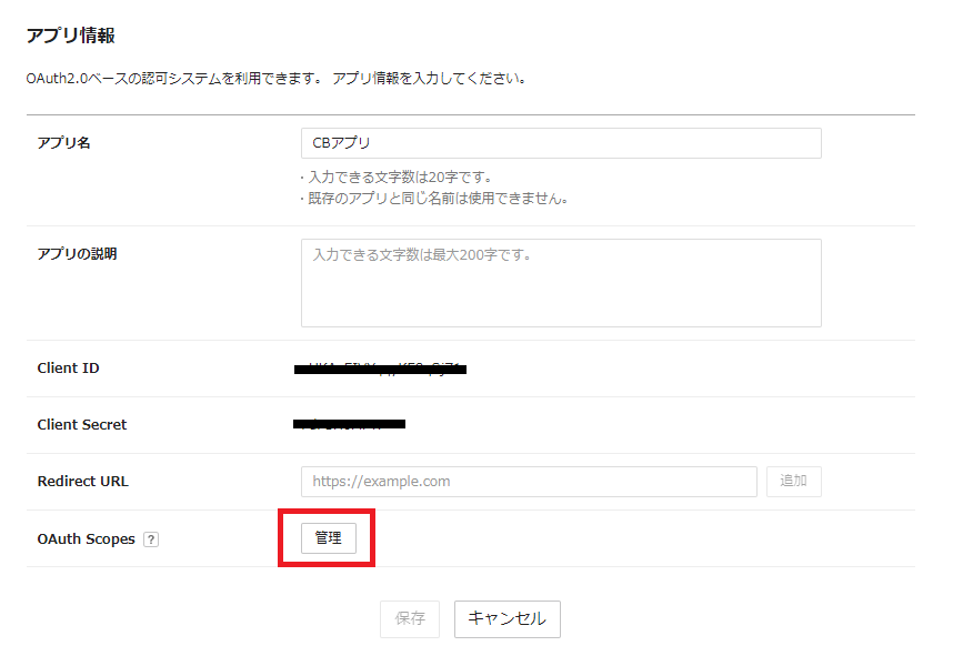 - 登録したアプリのアプリ情報設定画面で、OAuth Scopesの設定をするため管理ボタンをクリックします。