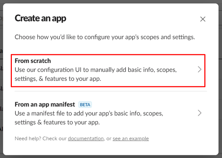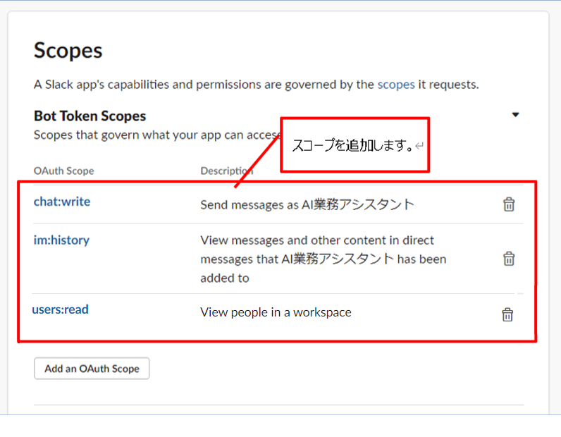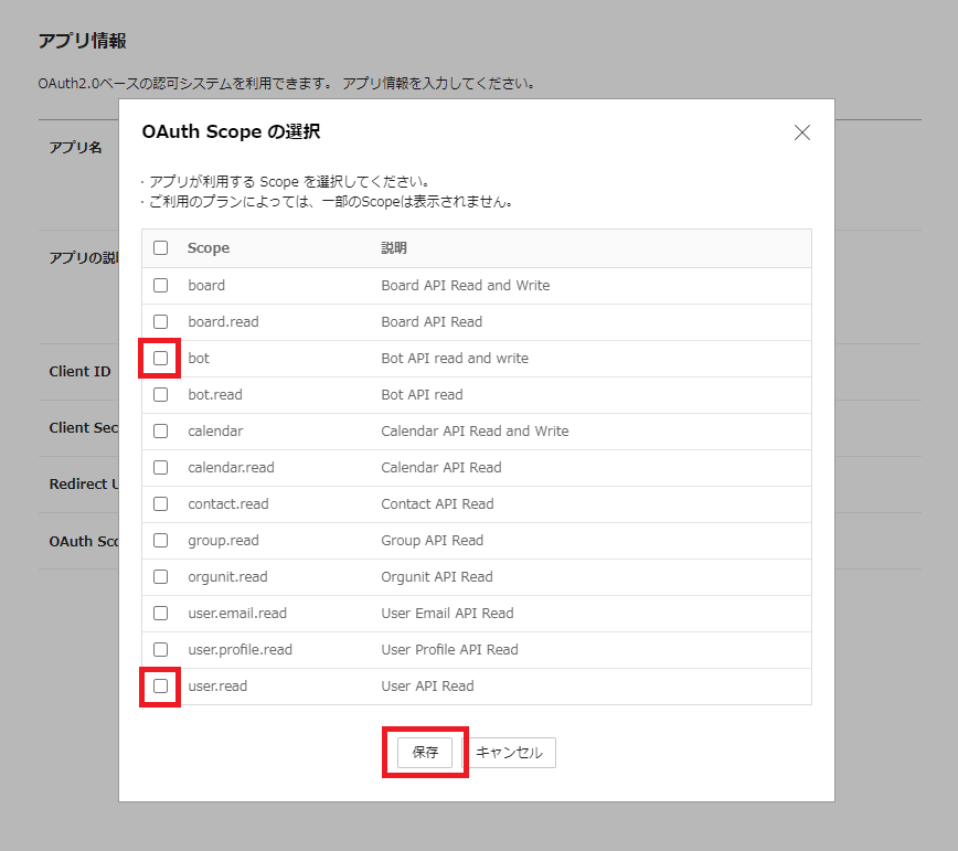 - ポップアップするOAuth Scopeの選択画面で「bot」と「user.read」を選択し保存ボタンをクリックします。