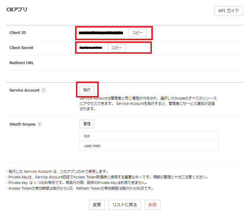 - アプリ情報画面で、「Client ID」「Client Secret」を控えます。 ※のちの手順で管理画面にこれらの値を登録します。