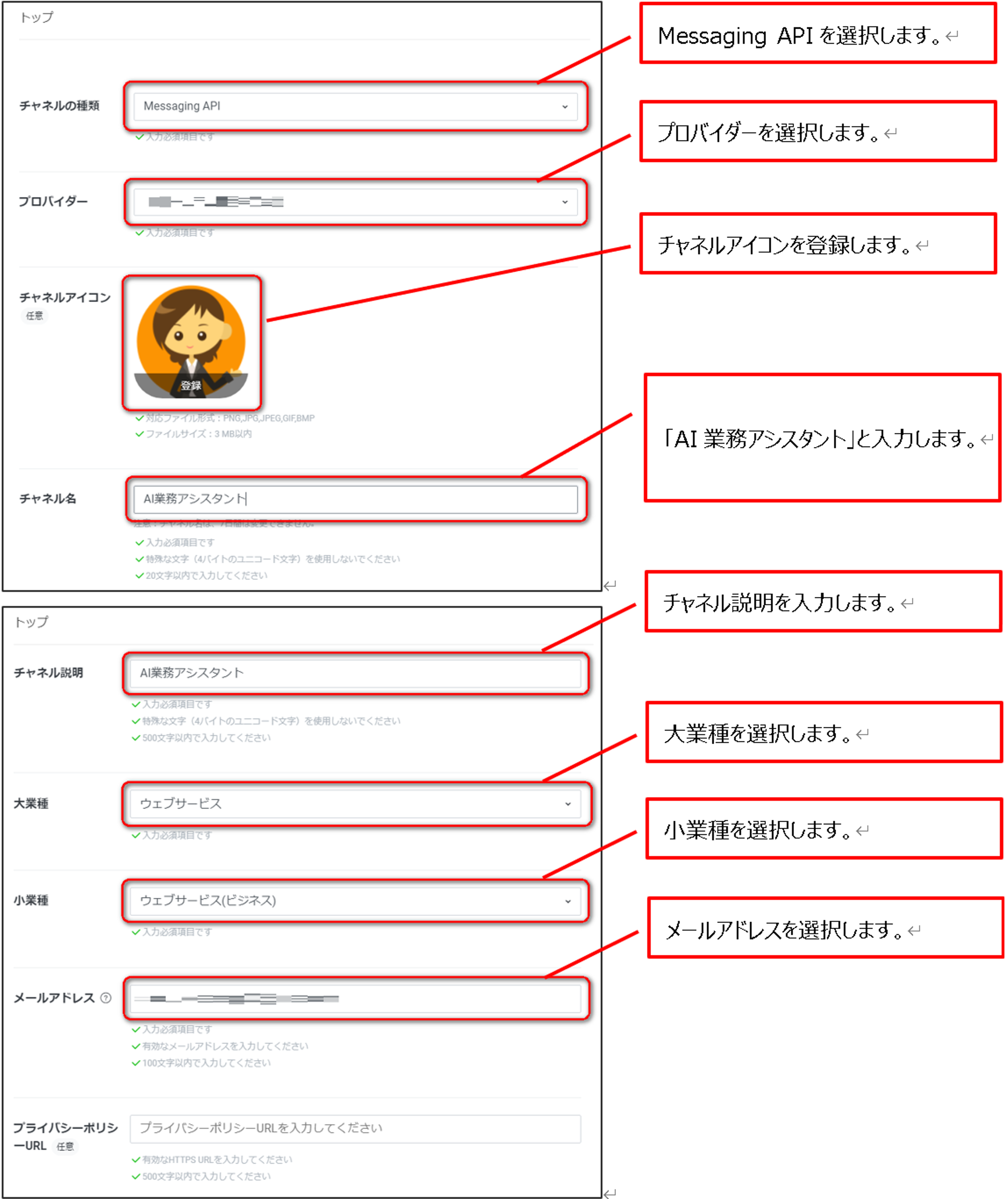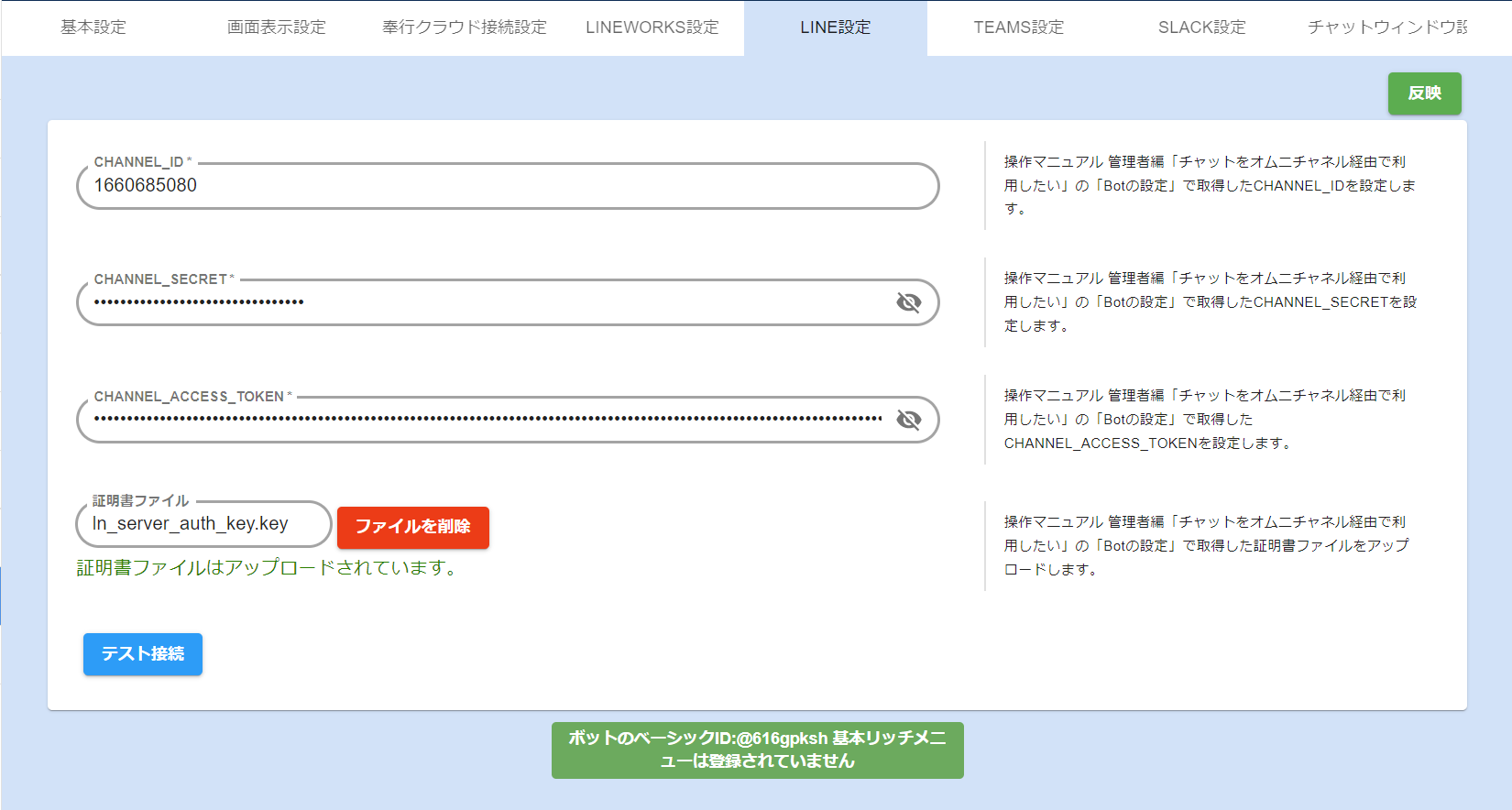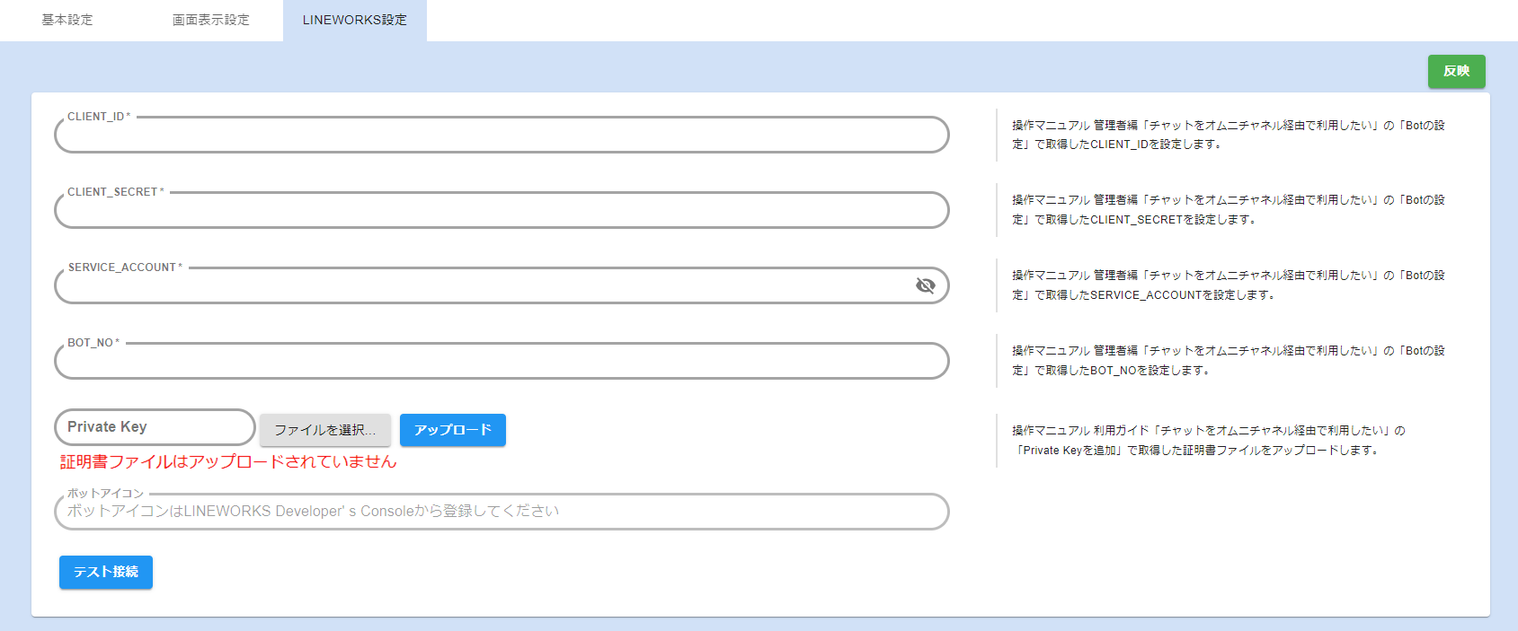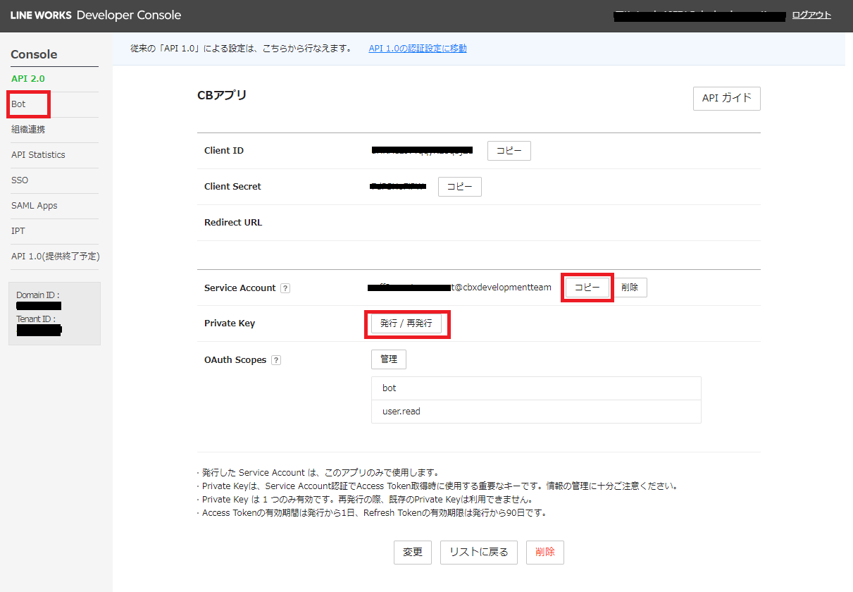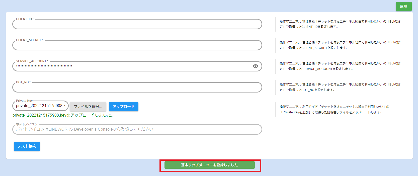 Botの設定・LINE WORKS管理者設定が終わった上で、控えた情報を登録します。