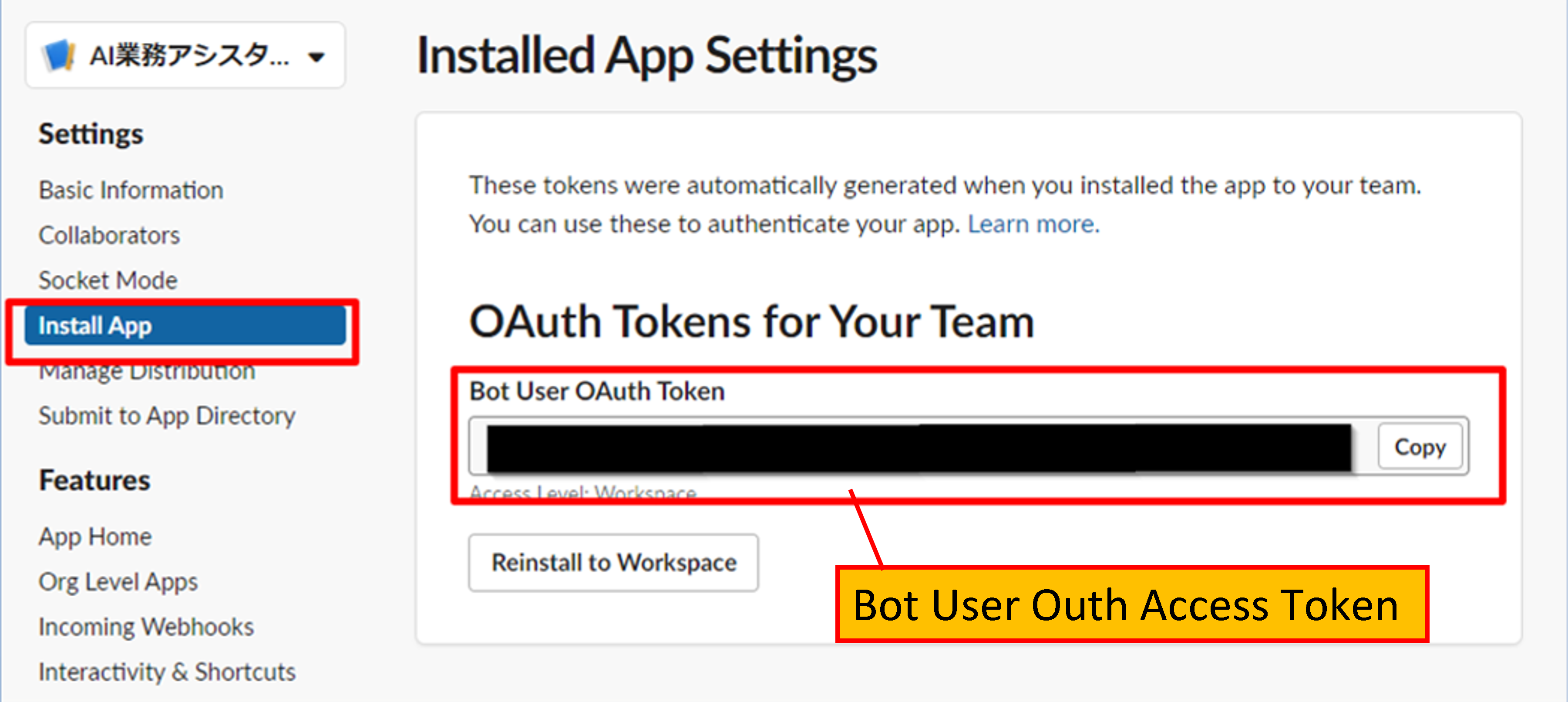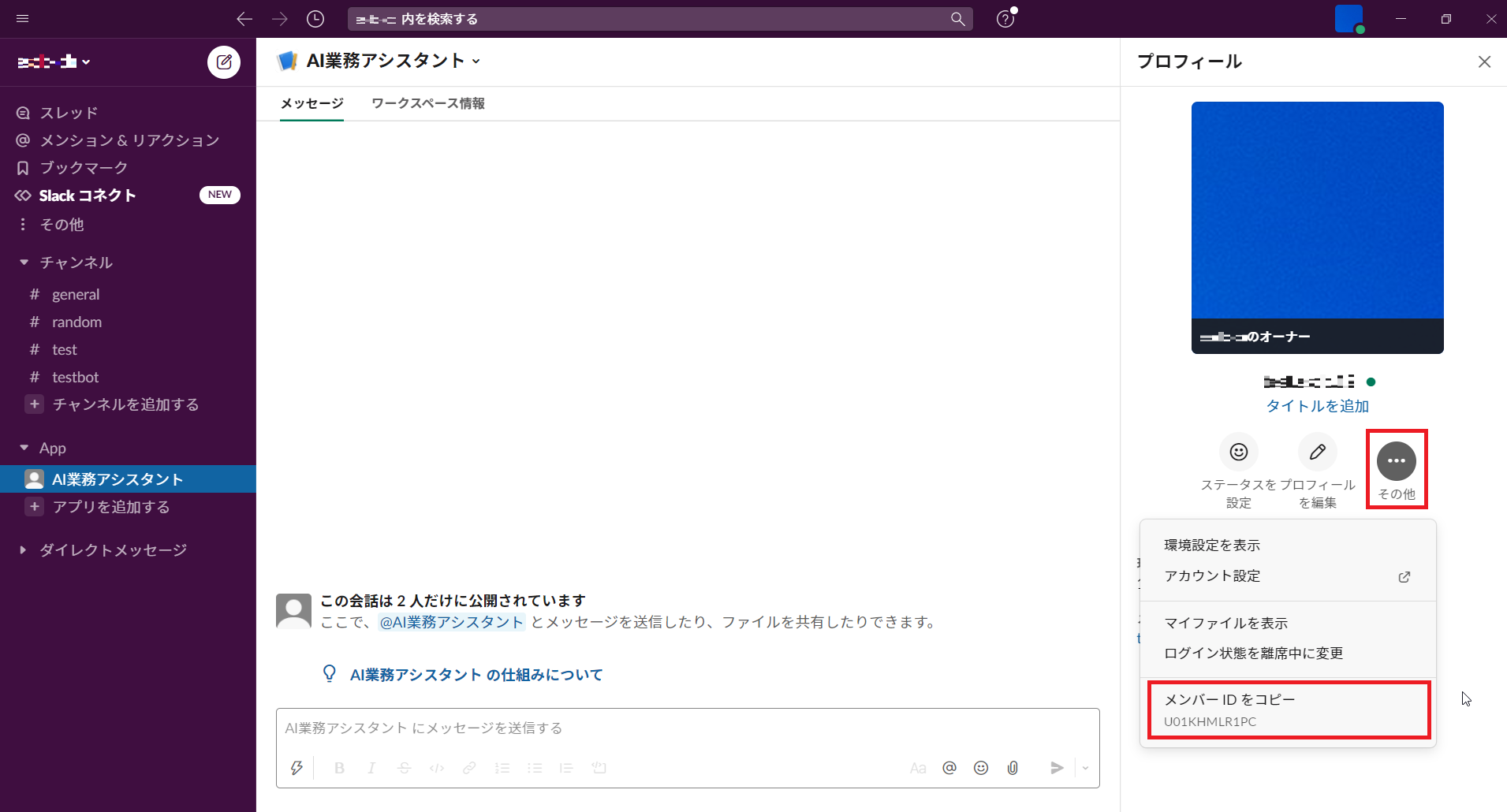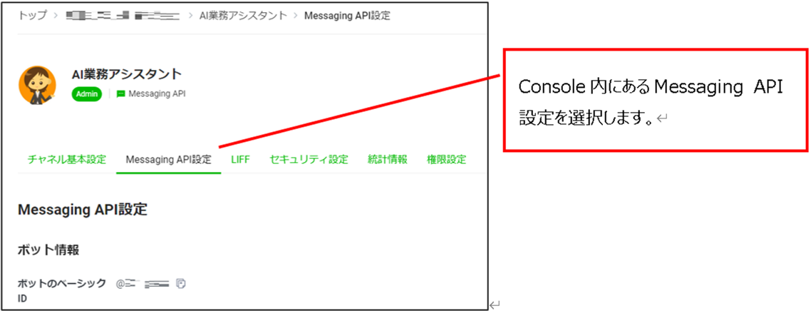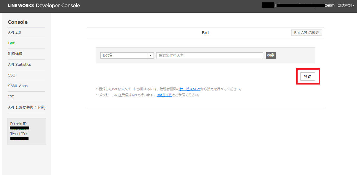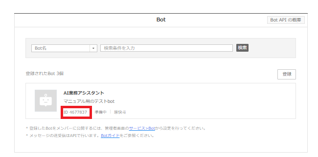 - Bot管理画面に表示された登録したBotのIDを確認します。