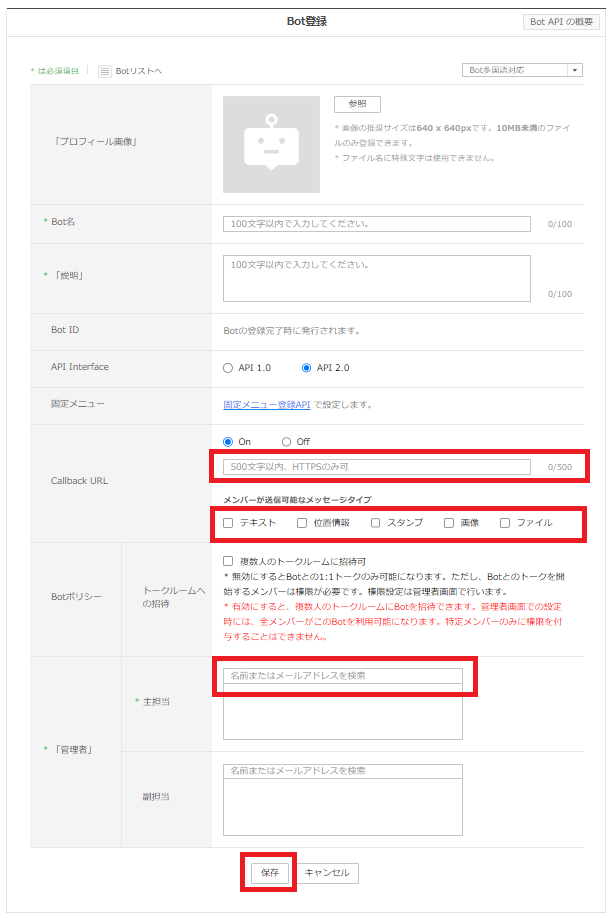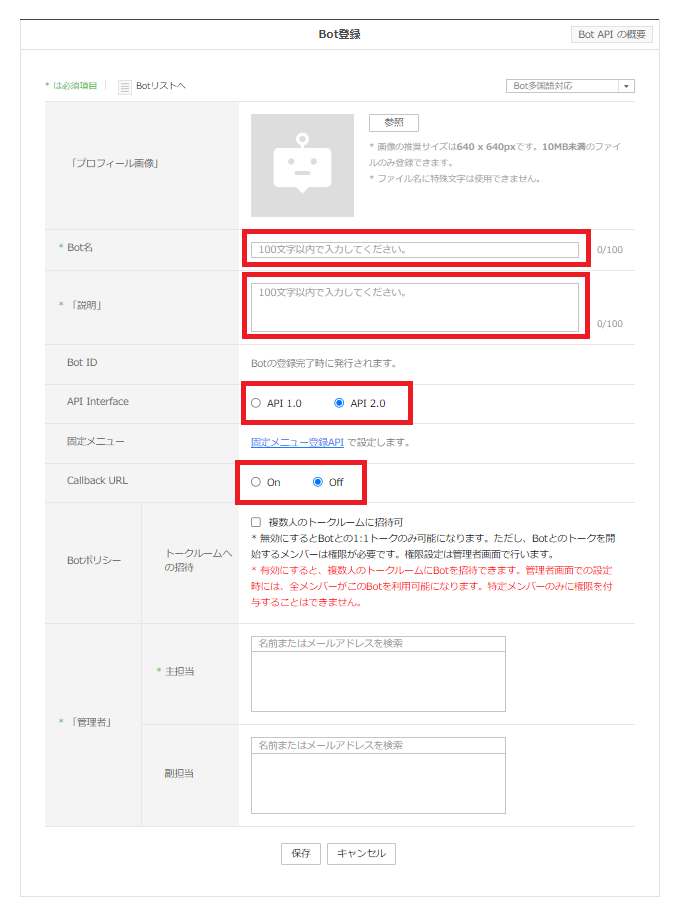 ※Bot名と説明は一般ユーザーがBotとの会話を開始する際に表示されます。 - API InterfaceがAPI 2.0を選択していることを確認します。