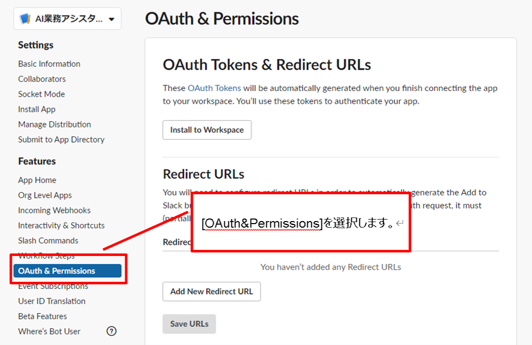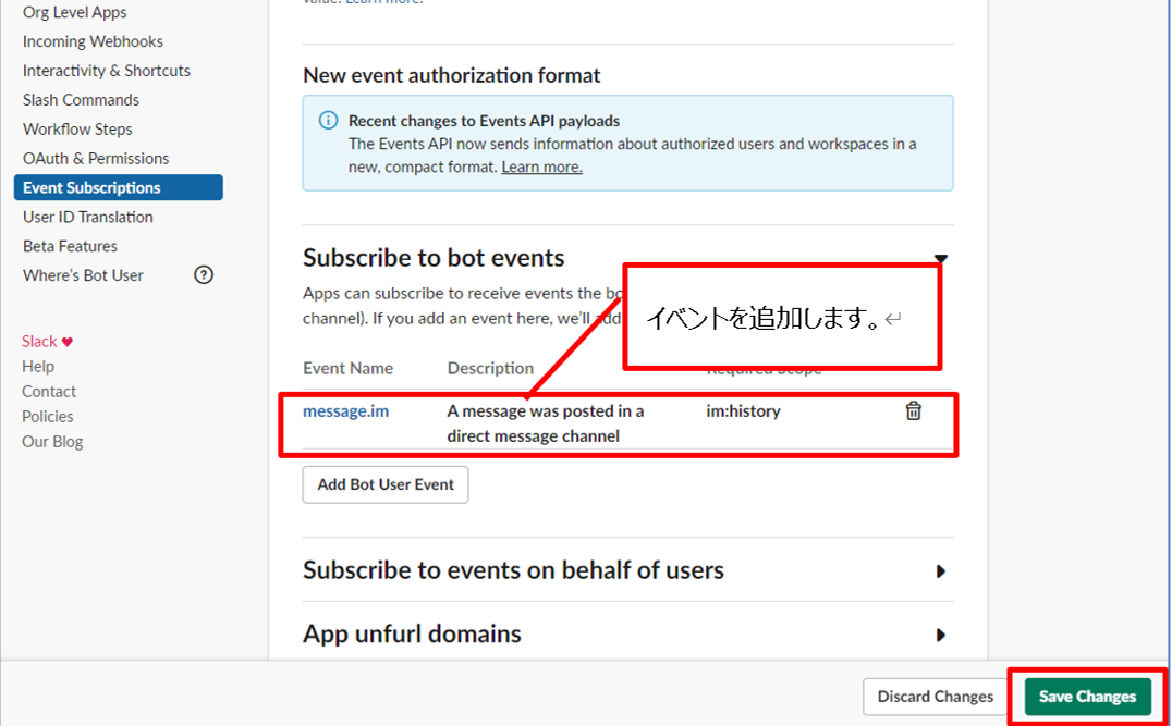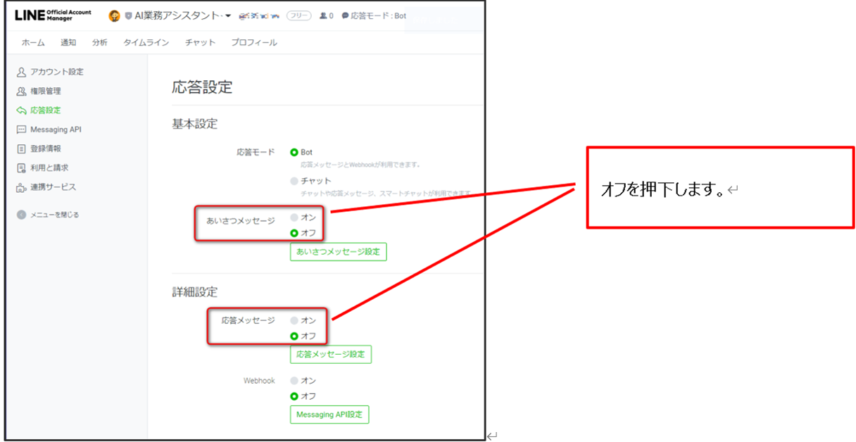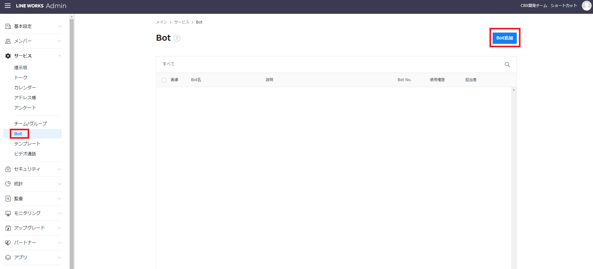 ※のちの手順で管理画面でこれらを登録します。 - サイドバーのメニューのBotをクリックしBot管理画面に移動します。