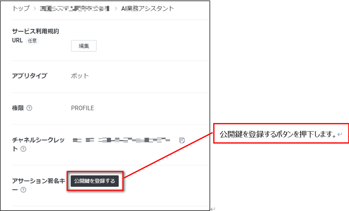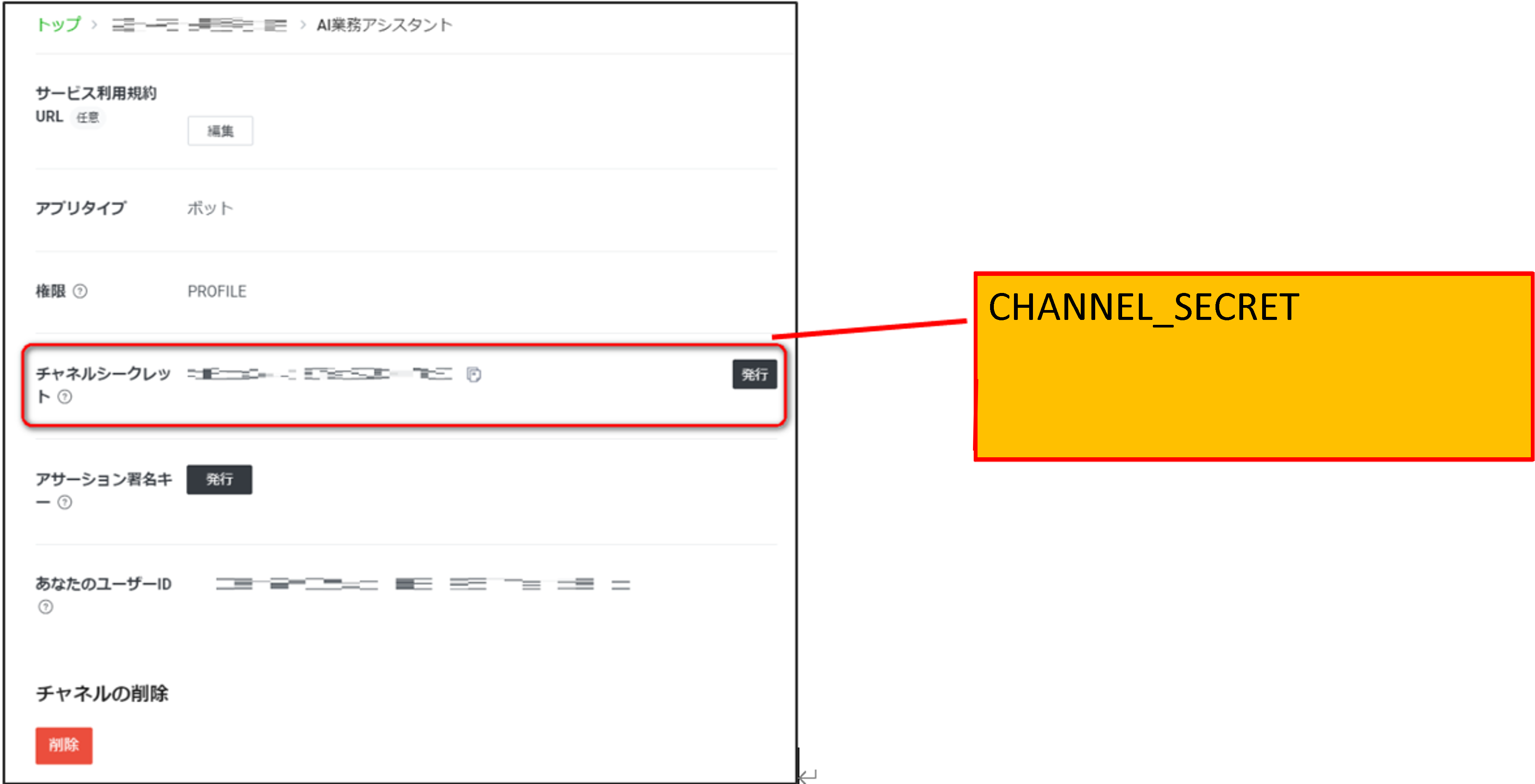 ※のちの手順で管理画面のCHANNEL_SECRETにチャネルシークレットを登録します。