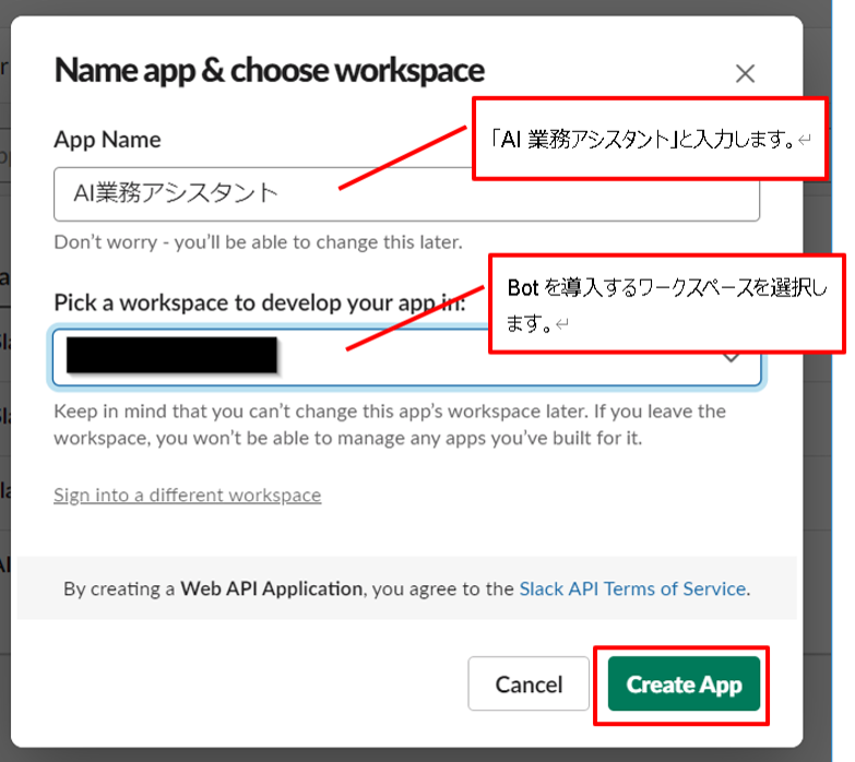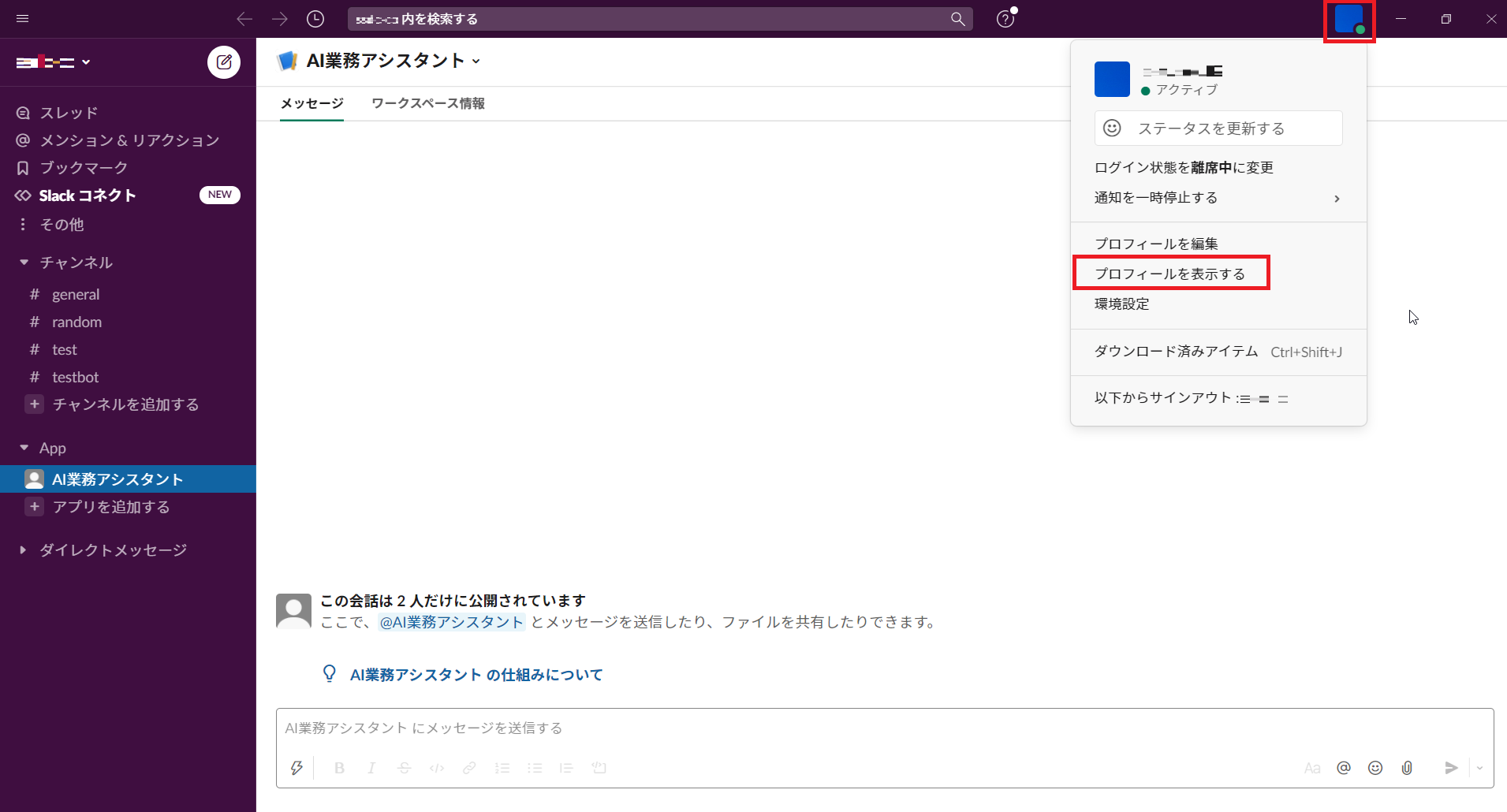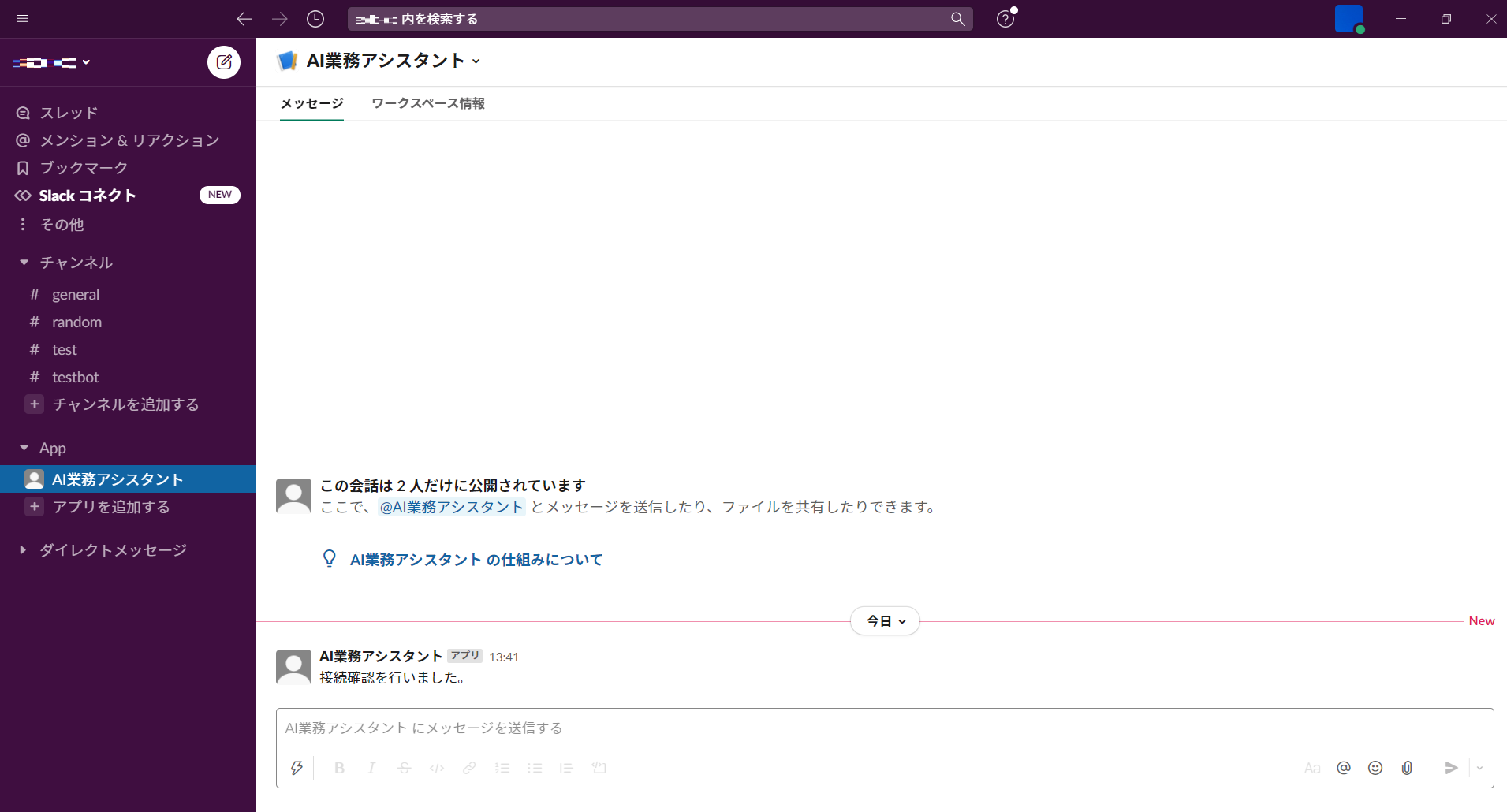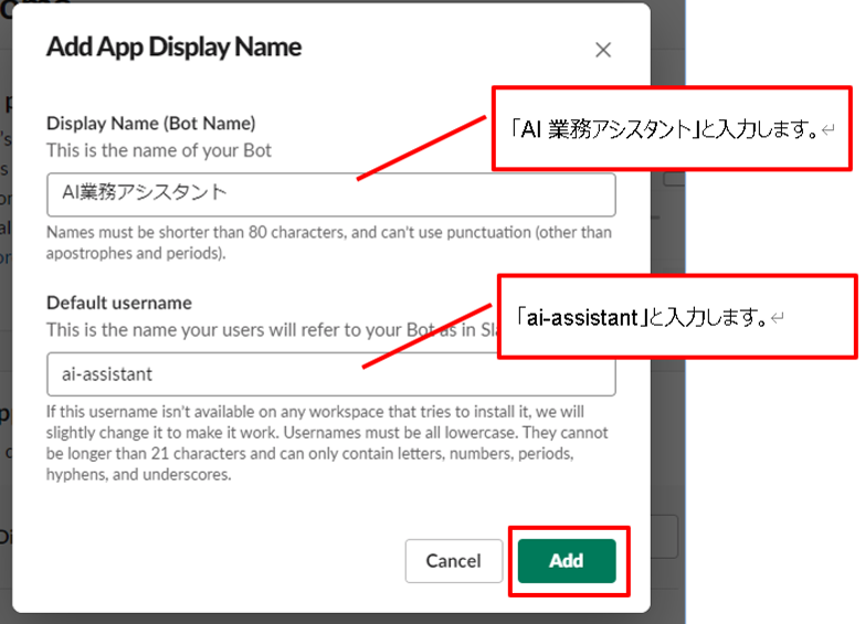 - Bot登録画面が表示されるので「Bot名」に「AI業務アシスタント」と入力し、「説明」に任意の文字を入力します。