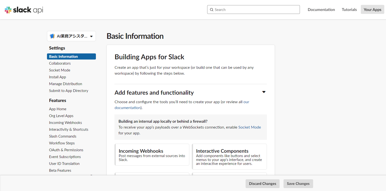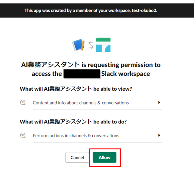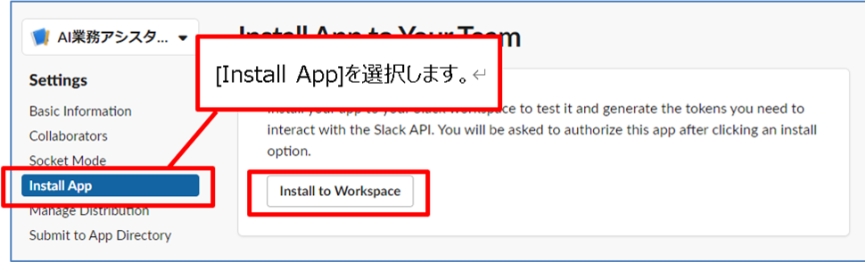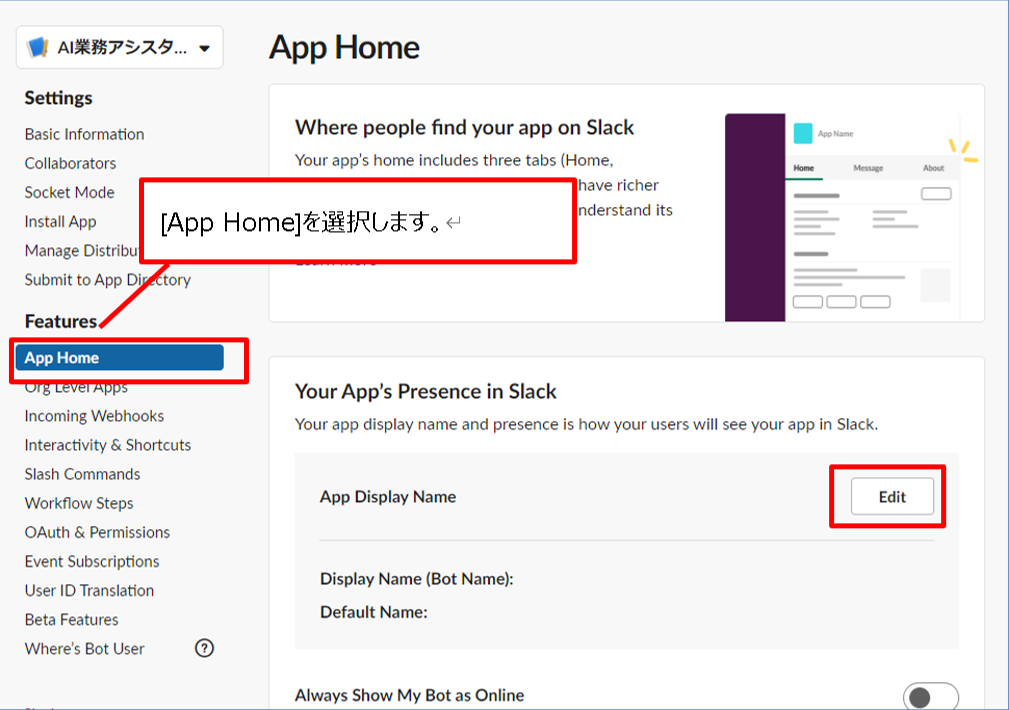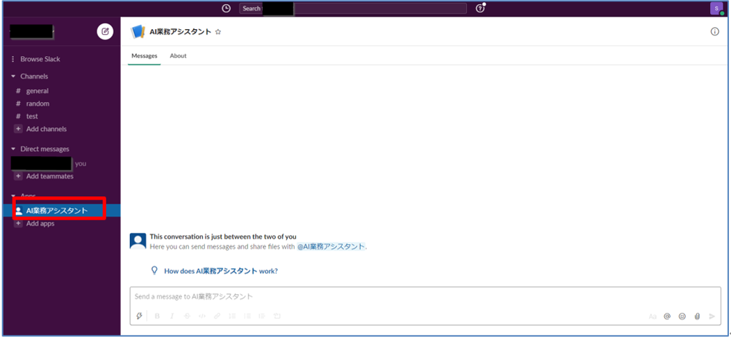 - Bot登録画面が表示されるので「Bot名」に「AI業務アシスタント」と入力し、「説明」に任意の文字を入力します。