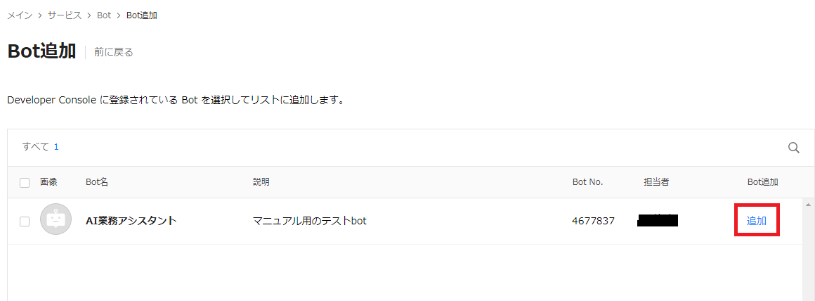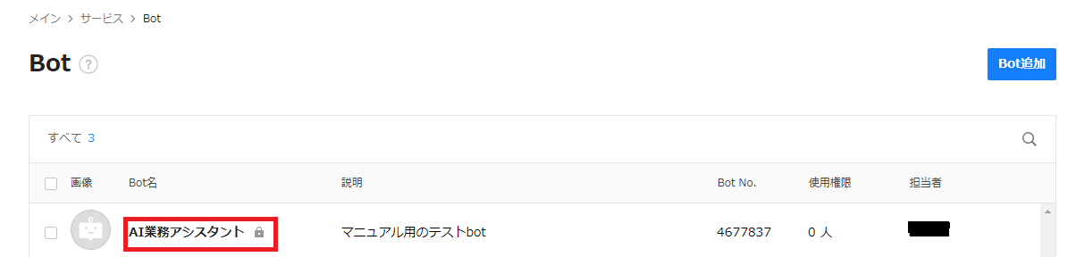 - Bot一覧画面で追加したBotのBot名をクリックします。