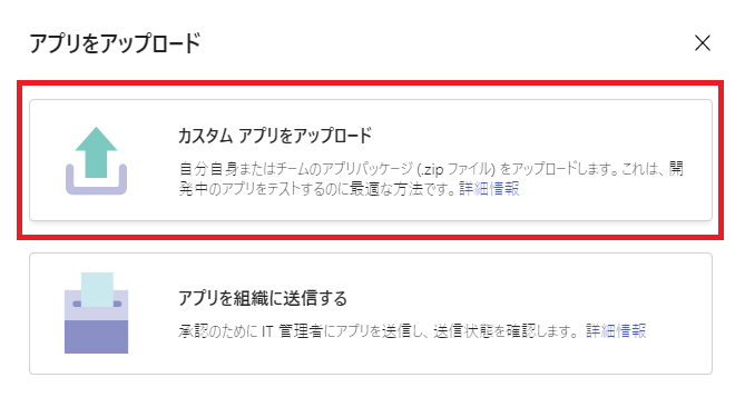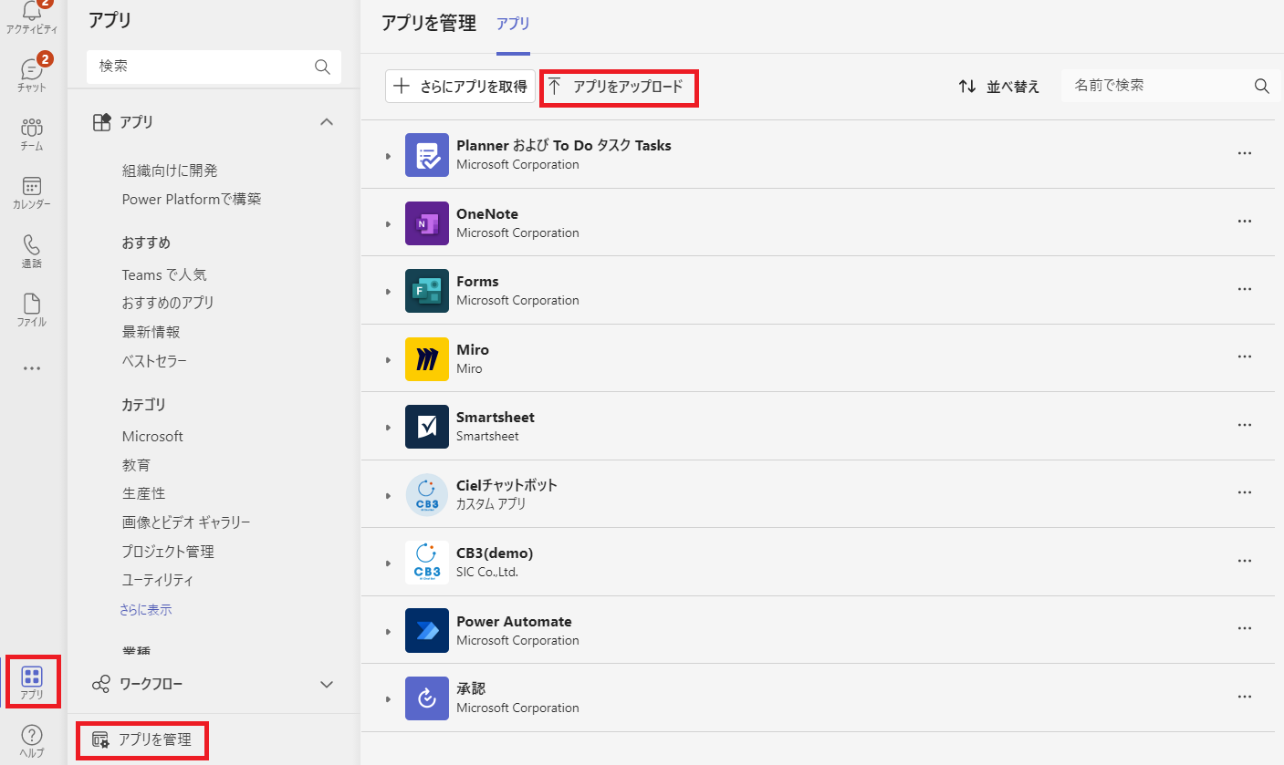 サイドバーの[アプリ]>[アプリを管理]>[アプリをアップロード]から、サービス提供会社から提供されたアプリ登録用ファイル(zipファイル)をアップロードします。