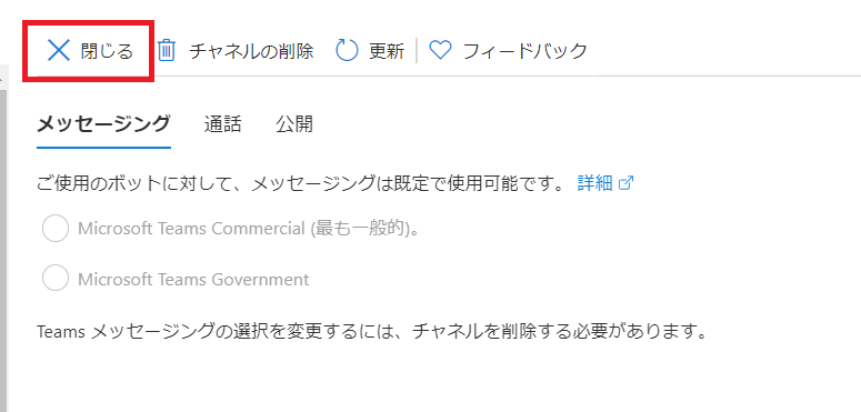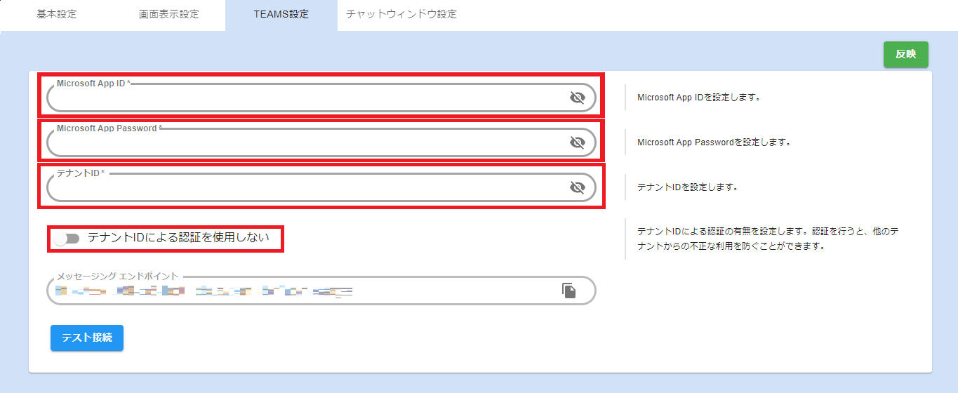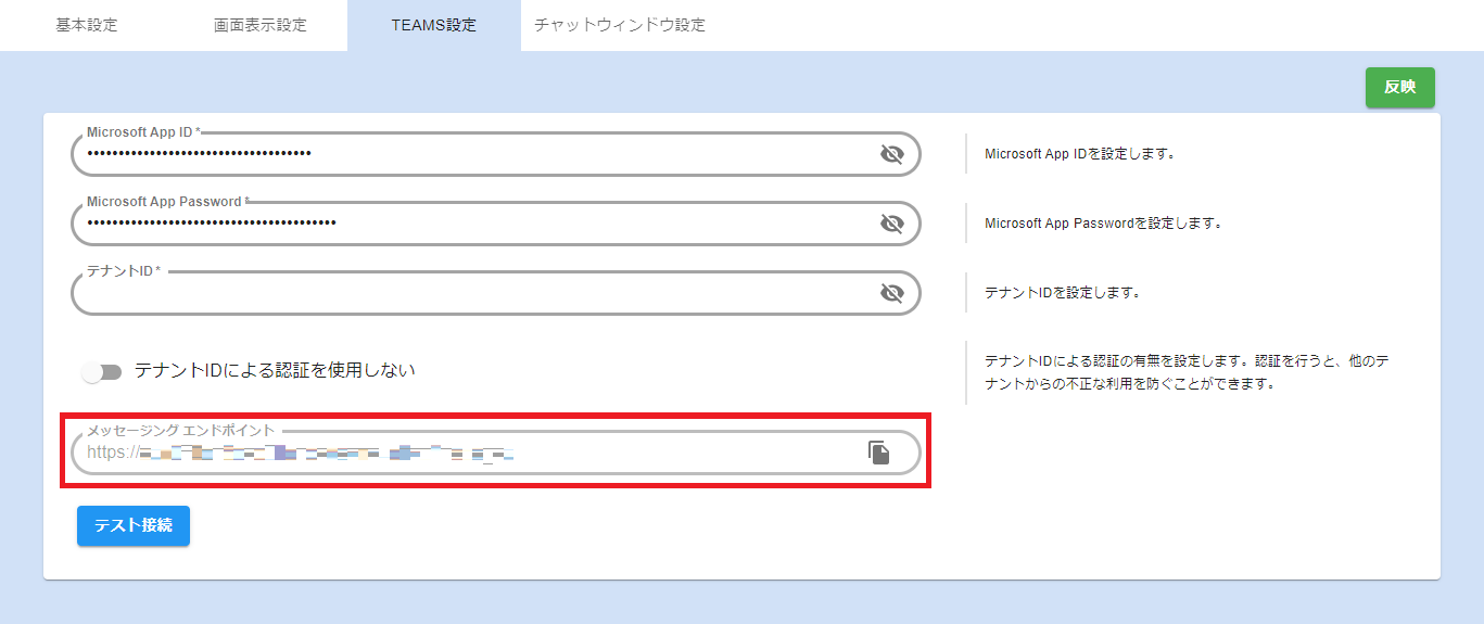 CBシリーズの管理画面を開き、設定>TEAMS設定のメッセージングエンドポイントをコピーし、azure側の画面に登録します。