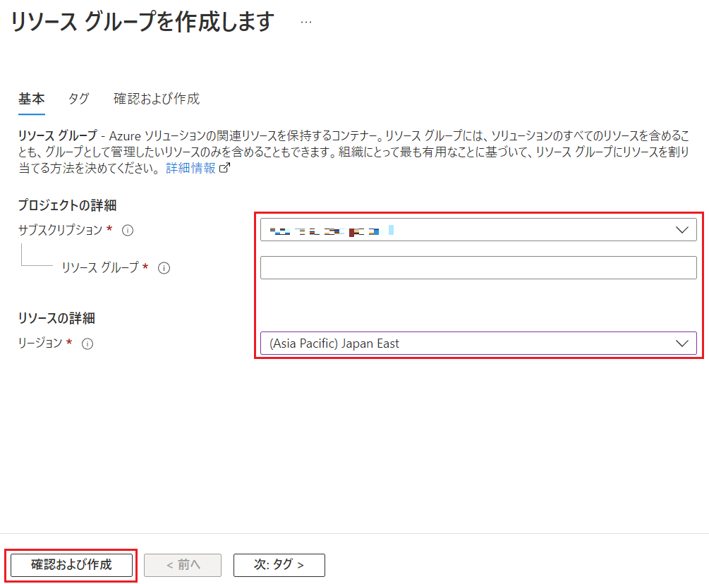サブスクリプション、リソース グループ、リージョンを設定し、[確認および生成]をクリックします。