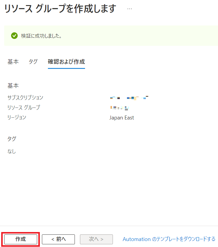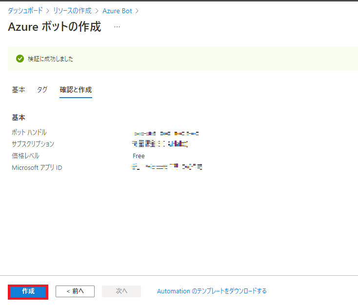 確認と作成タブでエラーが出ていなければ、[作成]をクリックします。