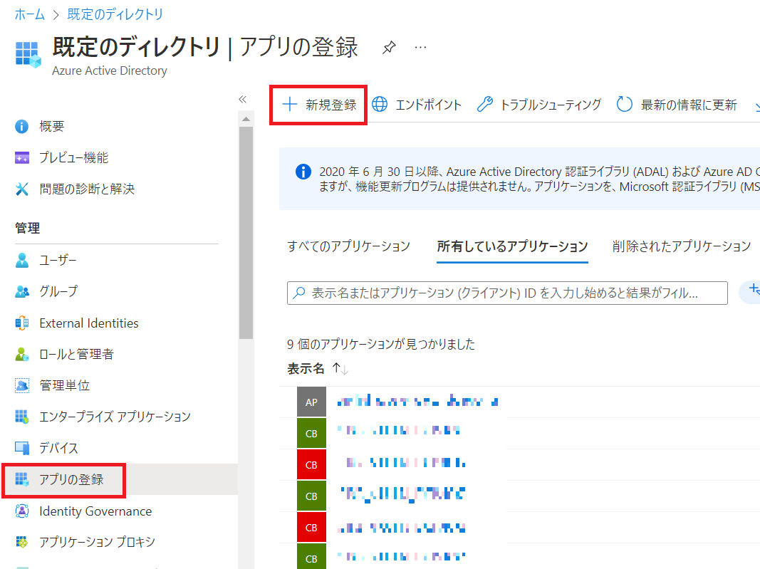 - ホーム画面からAzure Active Directoryのパネルをオープンし、左のメニューからアプリの登録、新規登録を選択します。