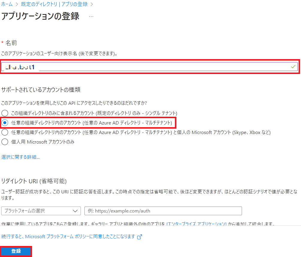 アプリケーションの登録画面で、「名前」(任意、チャットボットを識別する名前を付けてください。)、および「サポートされるアカウントの種類」に(任意の組織ディレクトリ内のアカウント(任意のAzure AD ディレクトリ - マルチテナント))を設定し登録ボタンをクリックします。