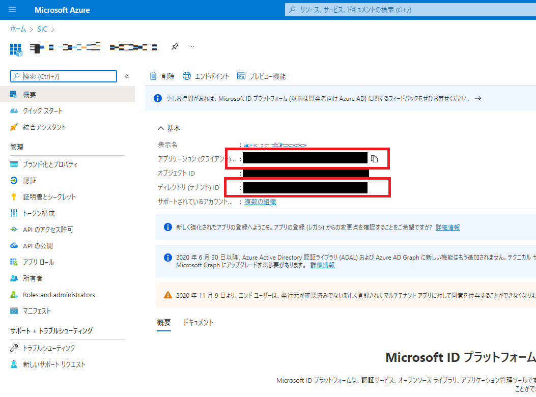 登録が終わるとアプリケーションの概要画面が表示されます。 アプリケーション (クライアント) …に表示されている「アプリケーション (クライアント) ID」、「ディレクトリ (テナント) ID」を控えてください。