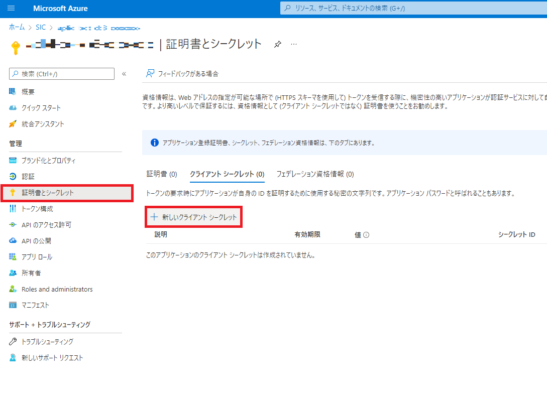同画面の左メニューから「証明書とシークレット」をオープンし、クライアントシークレットタブの新しいクライアントシークレットをクリックします。