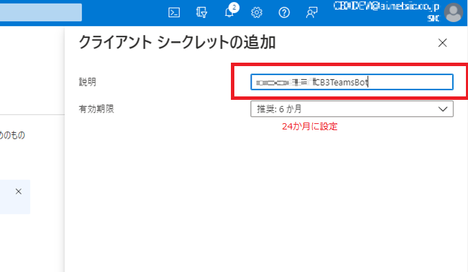 クライアントシークレットの追加画面で、説明(任意)、有効期限を24か月に設定し、追加ボタンをクリックします。
