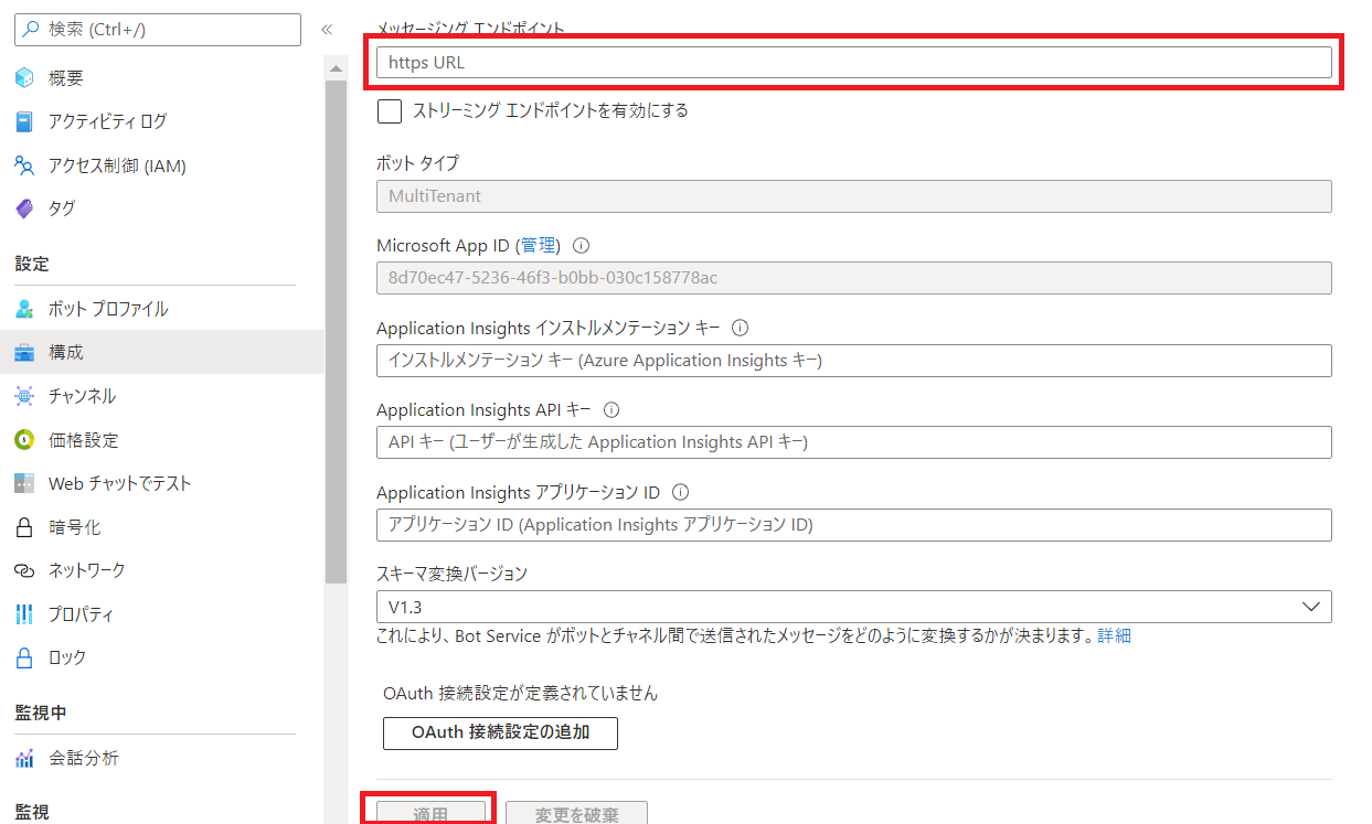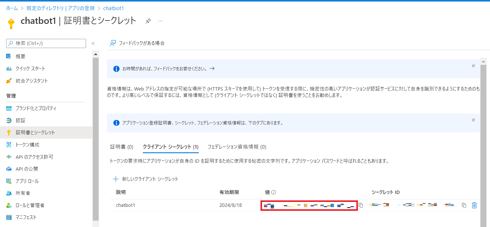 ※表示名に設定した値を控えてください。ここで設定した値がTeams上のチャットボットの表示になります。