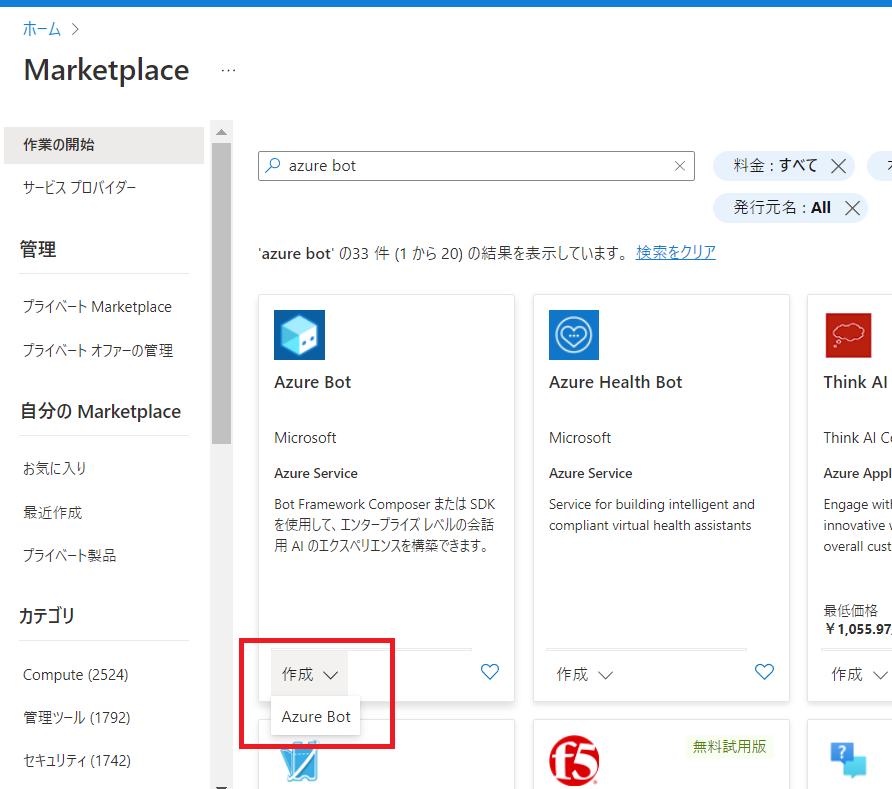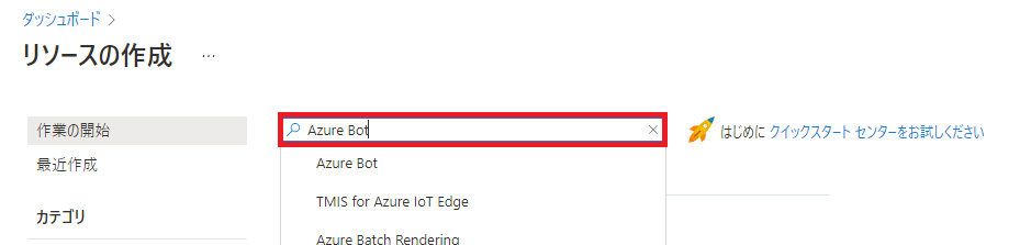 検索ボックスにAzure Botと入力しEnterを押下します。