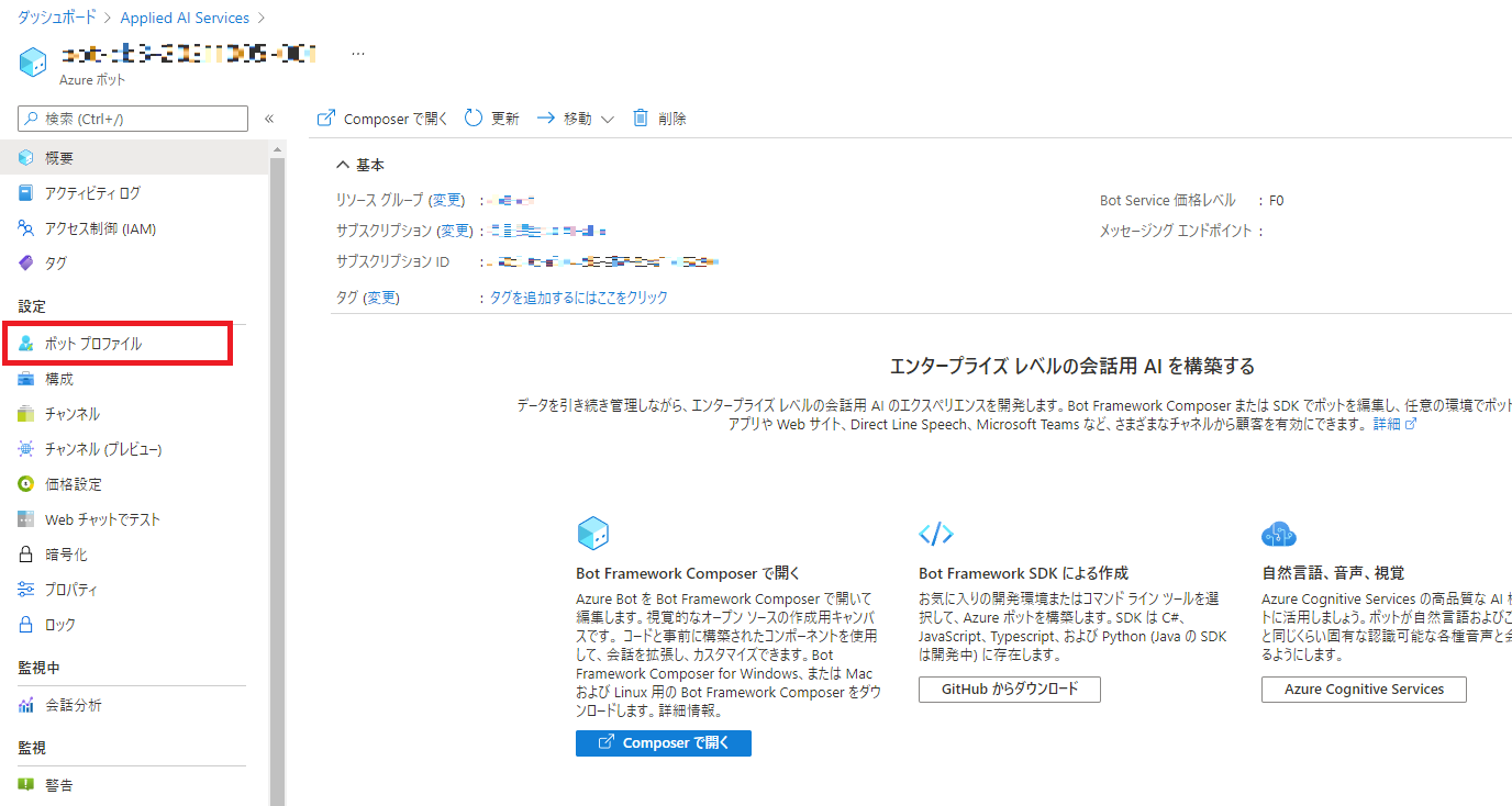 Botの[概要]ページで、左のメニューから[ボット プロファイル] を開きます。
