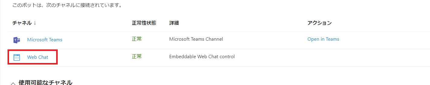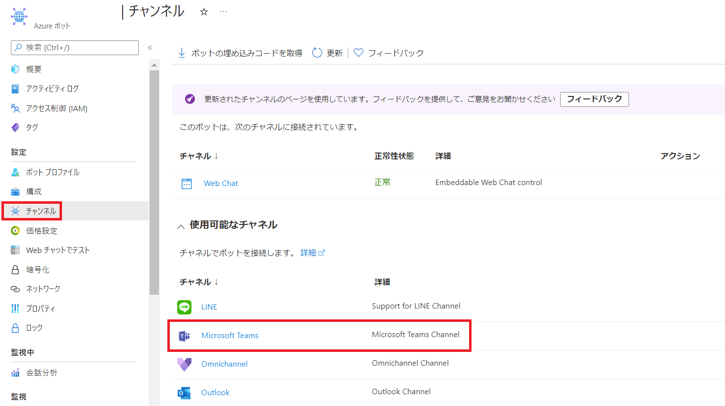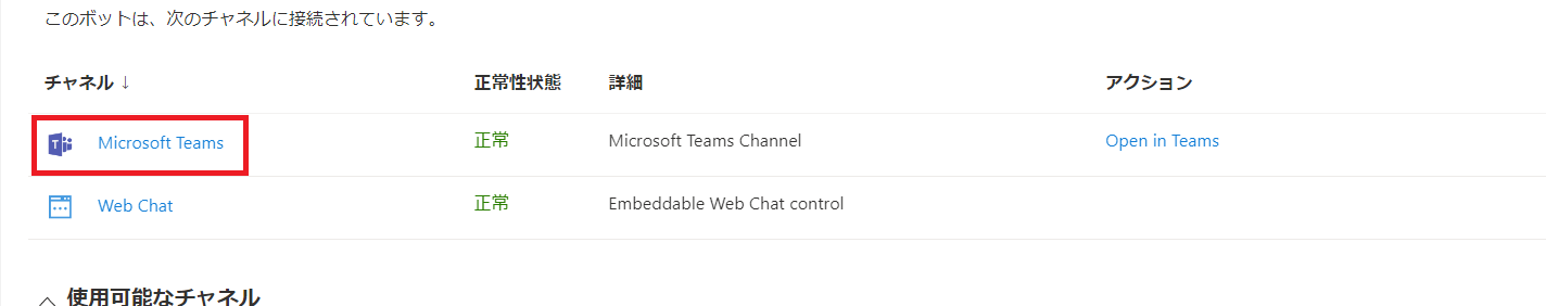 左のメニューから[チャンネル]を開きます。使用可能なチャネルから「Microsoft Teams」を選択します。
