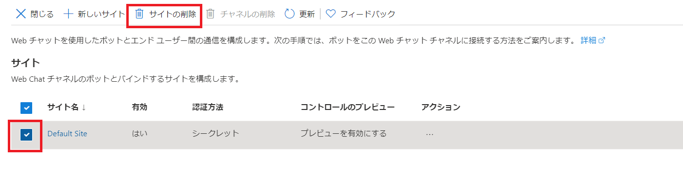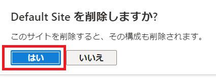 Default Site を選択し、「サイトの削除」ボタンをクリックします。