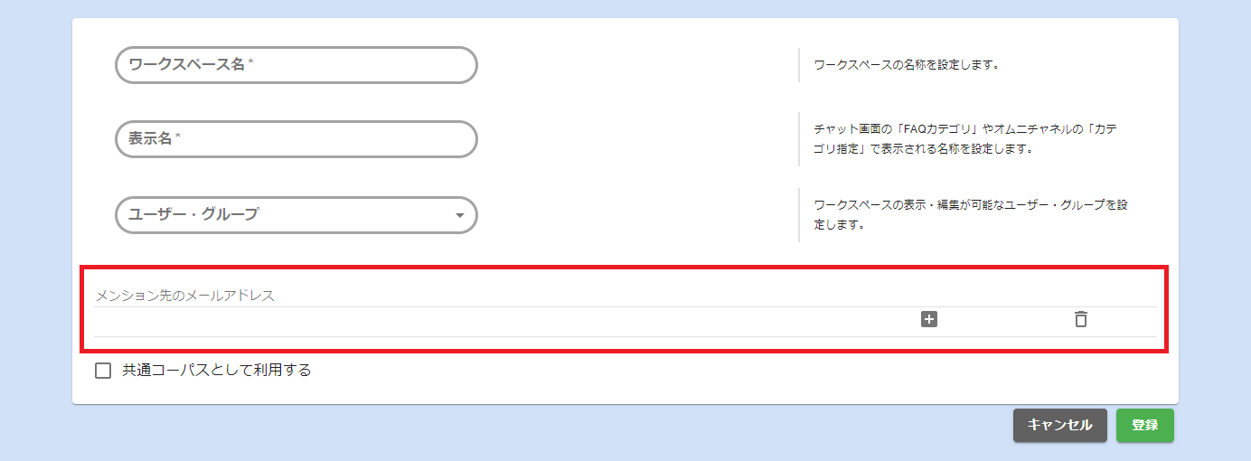 ワークスペースの登録時に、チャットボットが回答できなかった場合に、有識者へ回答を促すメンションを行う機能を設定することができます。