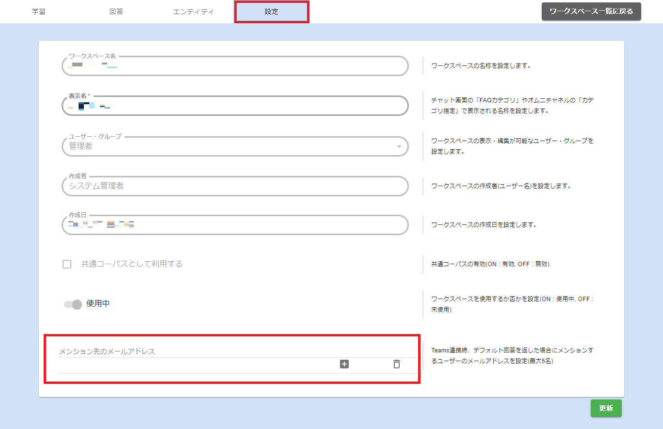 また、ワークスペースがすでに登録済である場合、ワークスペースの設定タブからメンション先の追加・変更を行う事も可能です。