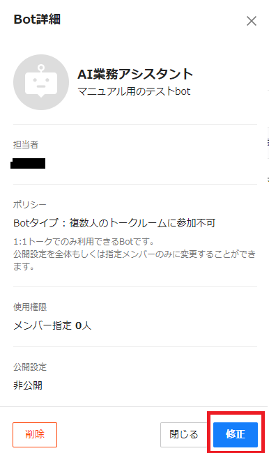 - 表示されるBot詳細画面で修正ボタンをクリックします。