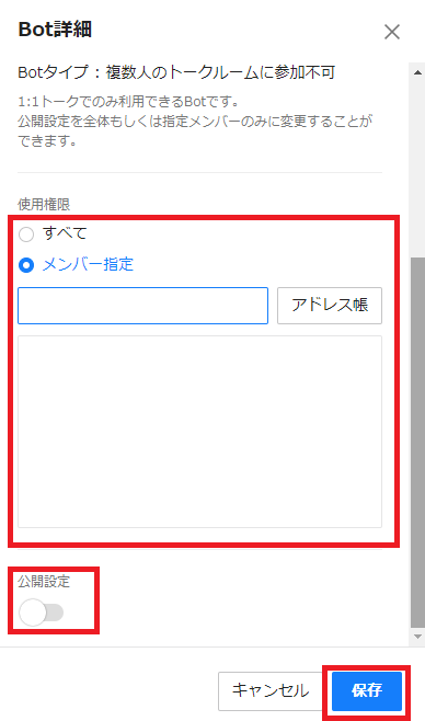 - 公開設定をOnにし、保存ボタンをクリックすると使用権限のあるメンバーがBotとトークできる状態になります。